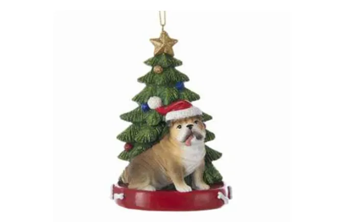What Better Way To Celebrate The Beloved Pet In Your Life Than With This Amazing Ornament! This Is Our Bulldog ! He/She Is Shown Sitting Patiently In Front Of A Beautiful Christmas Tree Complete With Glittering Ornaments And Star While Wearing A Santa Hat! Underneath The Tree And Dog Is A Red Platform That Has Small White Dog Bones On Either Side!