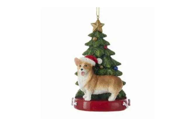 What Better Way To Celebrate The Beloved Pet In Your Life Than With This Amazing Ornament! This Is Our Corgi! He/She Is Shown Standing Patiently In Front Of A Beautiful Christmas Tree Complete With Glittering Ornaments And Star While Wearing A Santa Hat! Underneath The Tree And Dog Is A Red Platform That Has Small White Dog Bones On Either Side!