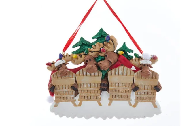 The Moose In Chairs Can Be Personalized Free Of Charge By Simply Christmas Staff! There Is Space For Each Family Members Name, And On The Base Of The Ornament Your Last Name And/Or The Date Can Be Displayed! The Names Will Be Put On The Chairs While The Last Name And/Or Date Will Be Placed On The White Base Of The Ornament. The Lettering For This Ornament Is Done In Black.