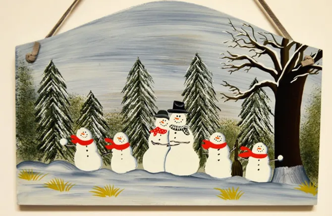 A Great Gift For Friends, Parents Or Grandparents! Made Of Wood And Hand Painted With 6 Snowmen Standing On The Edge Of A Snowy Forest. We Love The Detail Of The 2 Kids Throwing Snowballs! These Smiling Snowmen Will Add Charm To Any Wall, Door Or Hallway. Can Be Personalized Free Of Charge By Simply Christmas Staff. Measures 10.5″ Long And 7″ Tall. Comes With A Box.