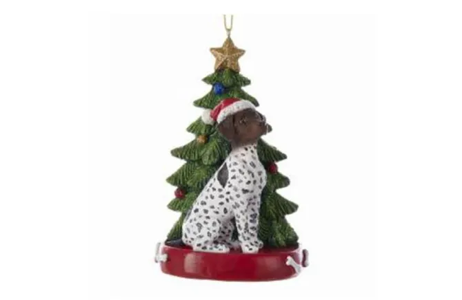 What Better Way To Celebrate The Beloved Pet In Your Life Than With This Amazing Ornament! This Is Our German Short-Haired Pointer! He/She Is Shown Sitting Patiently In Front Of A Beautiful Christmas Tree Complete With Glittering Ornaments And Star While Wearing A Santa Hat! Underneath The Tree And Dog Is A Red Platform That Has Small White Dog Bones On Either Side!