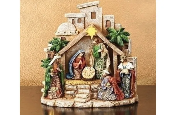 What Better Way To Complete Your Christmas Decorating Then With A Figure Fit For Your Beliefs! This Figure Displays A Town Scene With Palm Trees And Stone Buildings As The Holy Family Kneels Under A Star Lit Structure As The Three Kings Sit Near By. The Star The Is Displayed Above The Holy Family Lights Up. This Nativity Is Painted In A Warm Color Palette And Gold Accents.