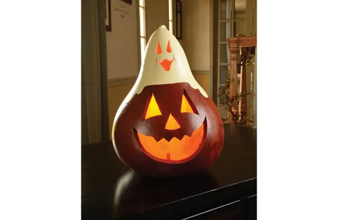 This Casper Jack Is A Burnt-Orange Jack-O-Lantern With A White Ghost Top And It Comes With An Electrical Light. He Is Approximately 9″ In Diameter. Warning: Gourds Are Flammable. Do Not Use Candles In Them Or Place Near Open Flames.