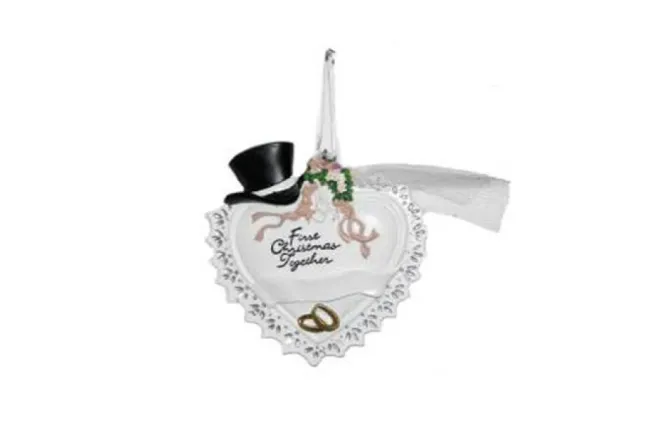 This Newlywed Bride And Groom Heart Promises To “Love, Honor, And Cherish” A Place On Your Tree! This Is Our Top Hat And Veil Ornament! Displayed Is A Large White Heart With A Black Top Hat And Veil Sitting On Top While The Words First Christmas Together Are Printed Inside The Heart As Two Gold Rings Sit Intertwined On The Bottom!