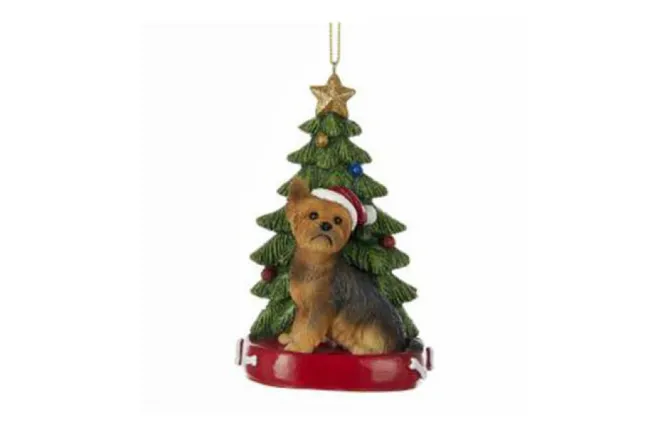 What Better Way To Celebrate The Beloved Pet In Your Life Than With This Amazing Ornament! This Is Our Yorkshire Terrier ! He/She Is Shown Sitting Patiently In Front Of A Beautiful Christmas Tree Complete With Glittering Ornaments And Star While Wearing A Santa Hat! Underneath The Tree And Dog Is A Red Platform That Has Small White Dog Bones On Either Side!