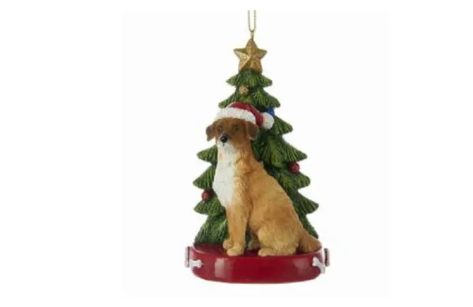 What Better Way To Celebrate The Beloved Pet In Your Life Than With This Amazing Ornament! This Is Our All American Mutt! He/She Is Shown Sitting Patiently In Front Of A Beautiful Christmas Tree Complete With Glittering Ornaments And Star While Wearing A Santa Hat! Underneath The Tree And Dog Is A Red Platform That Has Small White Dog Bones On Either Side!