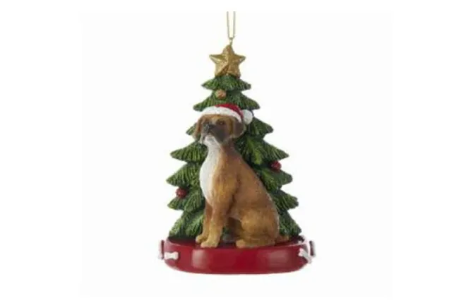 What Better Way To Celebrate The Beloved Pet In Your Life Than With This Amazing Ornament! This Is Our Boxer! He/She Is Shown Sitting Patiently In Front Of A Beautiful Christmas Tree Complete With Glittering Ornaments And Star While Wearing A Santa Hat! Underneath The Tree And Dog Is A Red Platform That Has Small White Dog Bones On Either Side!