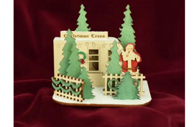 This Is Our Christmas Tree Lot Ginger Cottage! Each Cottage Has A Small Hole On The Underside Designed To Fit A Standard Christmas Tree Light, Once The Ginger Cottage Is Lit Up You Will See That Each Ginger Cottage Holds Delicate Details And Hidden Surprises! The First Surprise Upon Lighting Is The Delicate Scene Inside The 3D Figure.
