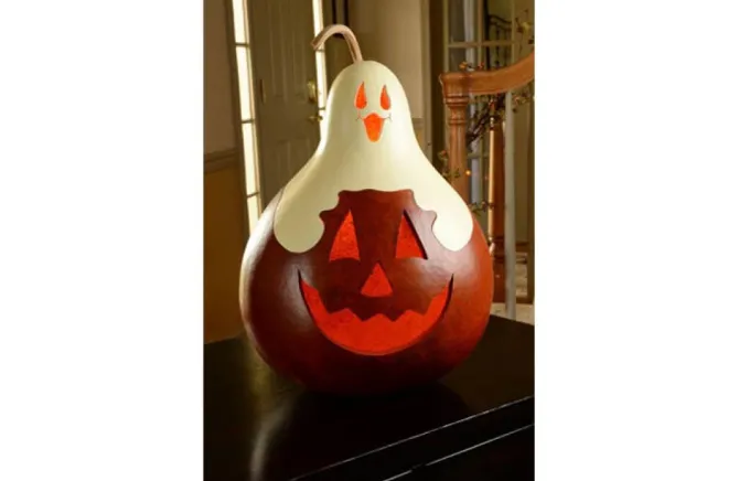 This Casper Jack Is A Burnt-Orange Jack-O-Lantern With A White Ghost Top And It Comes With An Electrical Light. He Is Approximately 12″ In Diameter. Warning: Gourds Are Flammable. Do Not Use Candles In Them Or Place Near Open Flames.