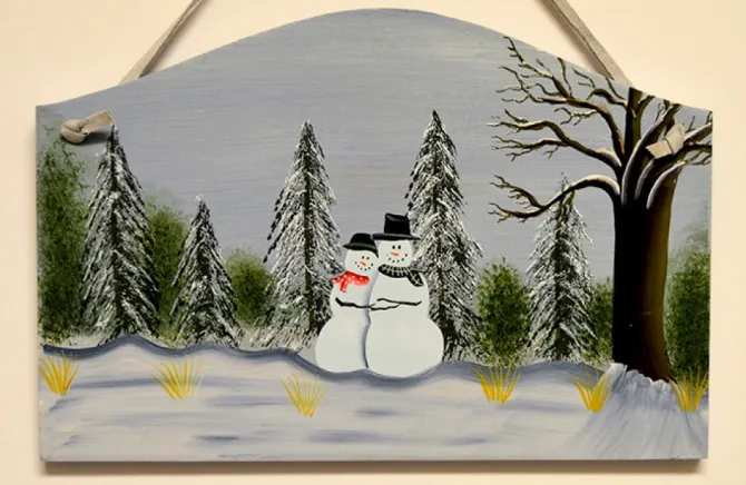 This Cute Snowman Plaque Is The Perfect Gift For A Couple! Made Of Wood And Painted With A Winter Forest Scene With 2 Snowmen Hugging. These Smiling Snowmen Will Add Charm To Any Wall, Door Or Hallway! Can Be Personalized For Free By Simply Christmas Staff. It Measures 10.5″ Long 7″ Tall. Comes With A Box.