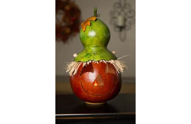 Owen Has A Jolly Burnt Orange Face And A Green Hat. This Scarecrow Jack-O-Lantern Is Sure To Make You Smile! He Is Approximately 8″ In Diameter And Comes With An Electric Light. Warning: Gourds Are Flammable. Do Not Use Candles In Them Or Place Near Open Flames.