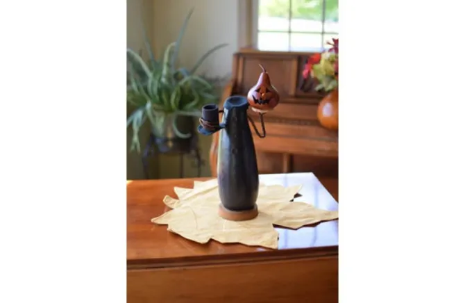This Adorable New Ichabod Is Approximately 12-14 Inches Tall. He Is Black In Color With A Burnt-Orange Head That Can Be Lit By Purchasing A Battery Operated Tea Light. Warning: Gourds Are Flammable. Do Not Use Candles In Them Or Place Near Open Flames.