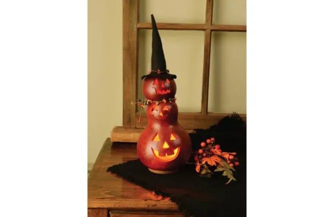Reba Is A Three Tiered Witch That Is Burnt Orange In Color And Is Decorated With Fall Berries And A Black Hat. She Is Approximately 5 1/2″ In Diameter And 14″ Tall. She Comes With An Electric Light. Warning: Gourds Are Flammable. Do Not Use Candles In Them Or Place Near Open Flames