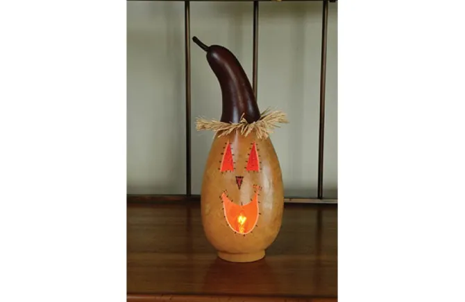 Sawyer Is A Natural Colored Scarecrow Head With A Walnut Colored Top. He Is Approximately 13″ Tall And Comes With An Electric Light. Warning: Gourds Are Flammable. Do Not Use Candles In Them Or Place Near Open Flames.
