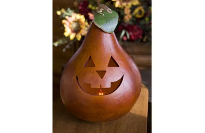 This Jack-O-Lantern Is Burnt-Orange In Color And Comes With An Electric Light. He Is Approximately 8″ In Diameter. Warning: Gourds Are Flammable. Do Not Use Candles In Them Or Place Near Open Flames.