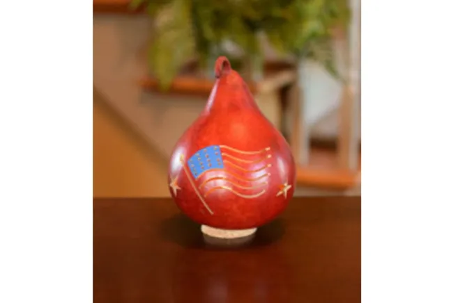 This Patriotic American Flag Gourd Is Red And Blue In Color. It Is Approximately 4 1/2″ In Diameter And Can Be Lit By Purchasing A Battery-Operated Tea Light.