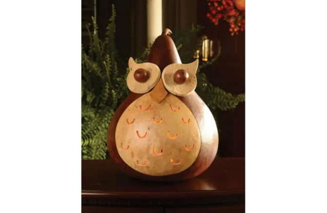 Our Wise Old Owl, Professor, Is The Perfect Fall Decoration. He Would Make A Great Gift, Especially For A Teacher.He Is Walnut And Natural In Color And Comes With An Electric Light. He Is Approximately 9″ In Diameter. Warning: Gourds Are Flammable. Do Not Use Candles In Them Or Place Near Open Flames