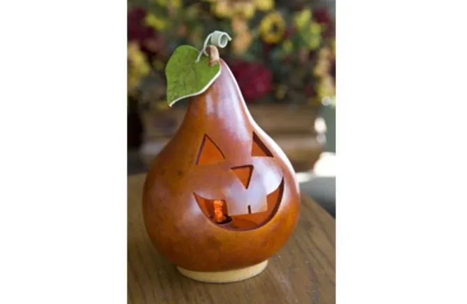 This Jack-O-Lantern Is Burnt-Orange In Color And Comes With An Electric Light. He Is Approximately 5″ In Diameter. Warning: Gourds Are Flammable. Do Not Use Candles In Them Or Place Near Open Flames