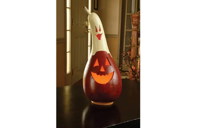 This Casper Jack Is A Burnt-Orange Jack-O-Lantern With A White Ghost Top And It Comes With An Electrical Light. He Is Approximately 11″ Tall. Warning: Gourds Are Flammable. Do Not Use Candles In Them Or Place Near Open Flames.