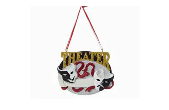 Here Is A Great Way To Celebrate The People You Love And What They Love To Do! This Is Our Theater Ornament! It Features A Black And White Background With Two Black And White Masks On Either Side Of A Red Ribbon. In Large Gold Glittering Letters Is The Word Theater! A White Banner Sits At The Bottom For Personalizing!